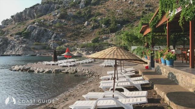 Çiftlik A large bay on N of Çiftlik Adası. There are sufficient depths on both passages. The bottom is weed-sand. Boats can be pushed off in 5-9 m on the western side. The slopes are covered by pine and olive trees. Çiftlik Koyu provides sheltering from breeze, but it is open to south. Breeze blows down from valley behind. There are gusts in the bay. There are number of jetties of the restaurants. There are laid moorings tailed on jetties. Water and electricity connections are available. Provisons can be found from the grocery shops. Wireless connections are provided from the reastaurants. Regular minibus services are available to Bayır (7 km) and Marmaris (35 km). This bay is popular for the tripper boats from Marmaris, but it is quite after 16.00 pm. The settings in Çiftlik are impressive.